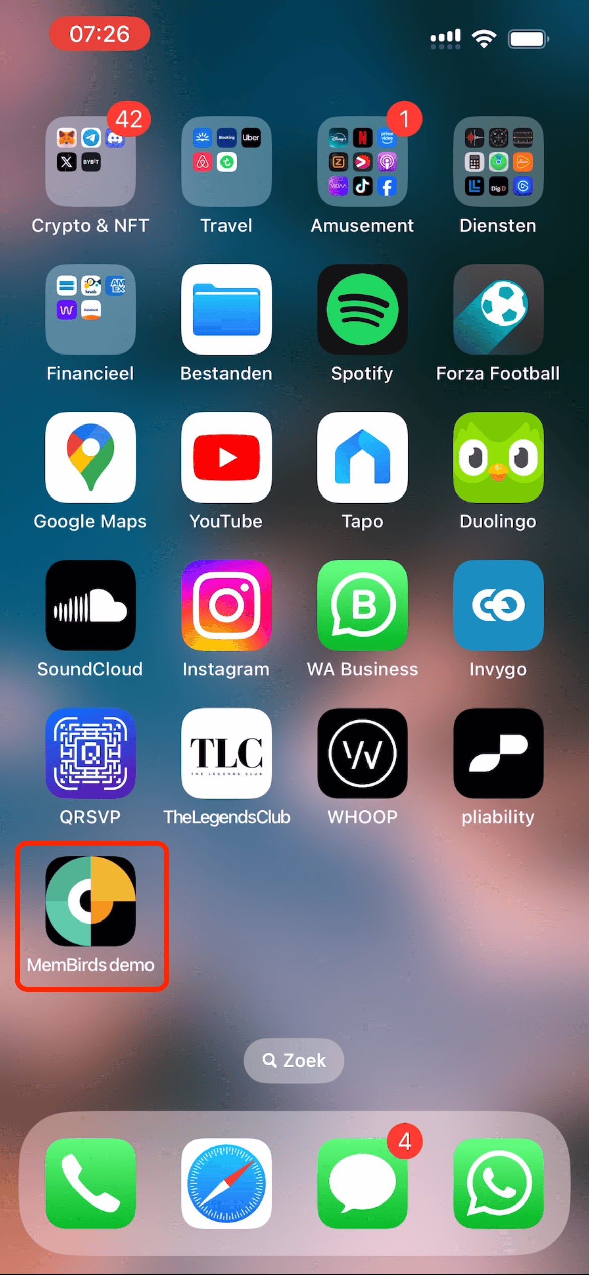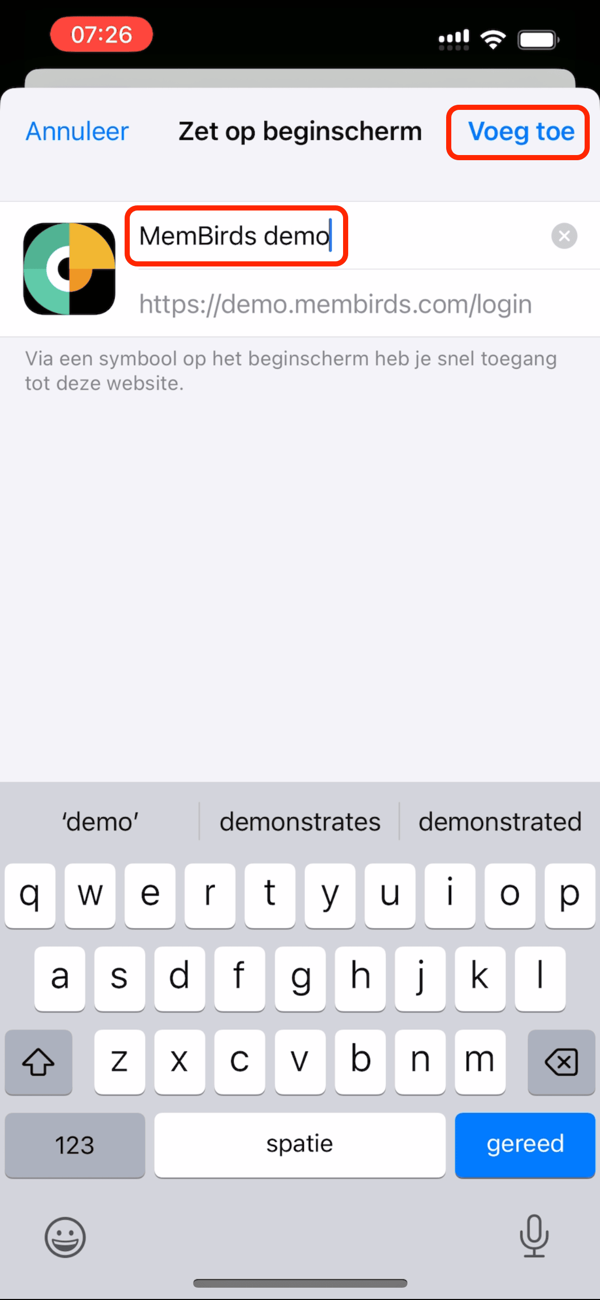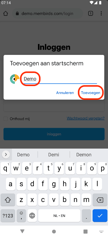 Stap 1: Ga binnen de internet browser naar de MemBirds omgeving waarvan je de “app” wil gebruiken. In het is dit voorbeeld demo.membirds.com