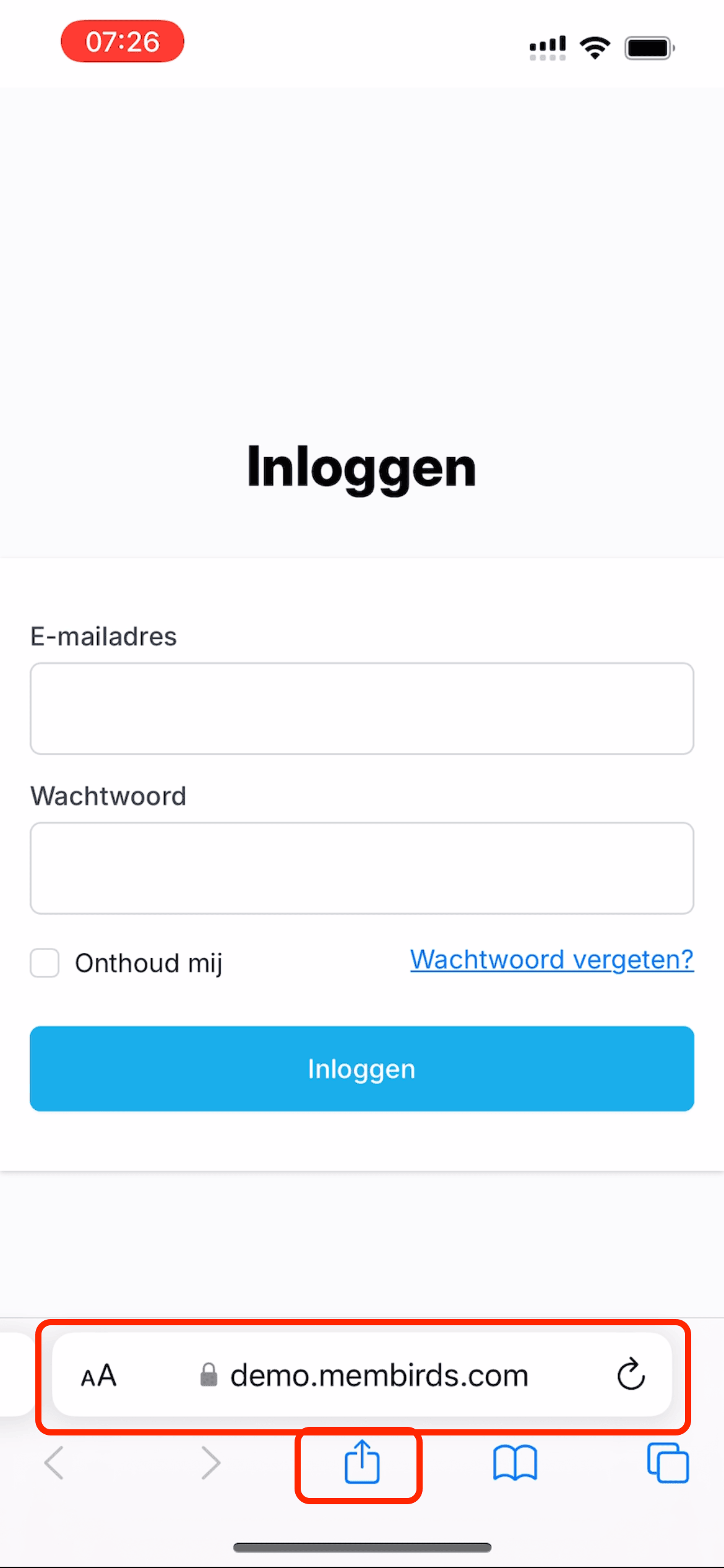 Stap 1: Ga binnen de internet browser naar de MemBirds omgeving waarvan je de “app” wil gebruiken. In het is dit voorbeeld demo.membirds.com. Klik hier op het deel-icoon (vierkant met pijltje omhoog) in de taakbalk onderin.